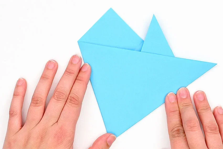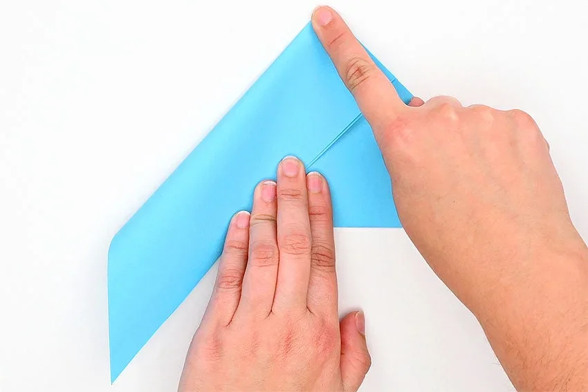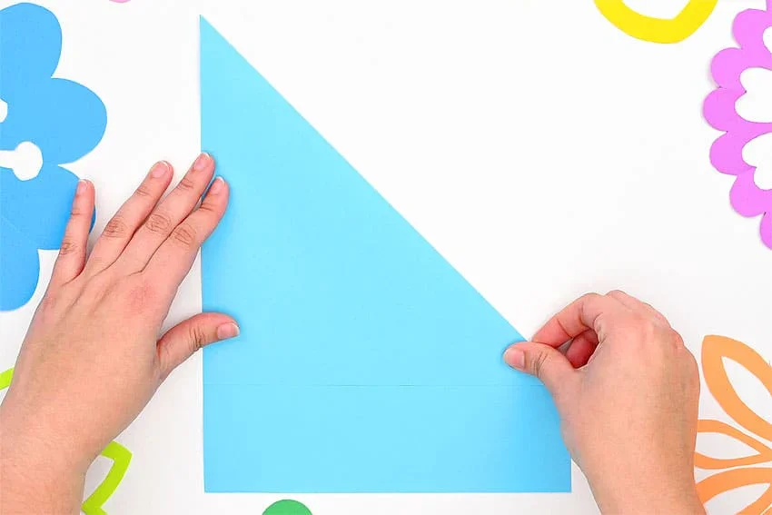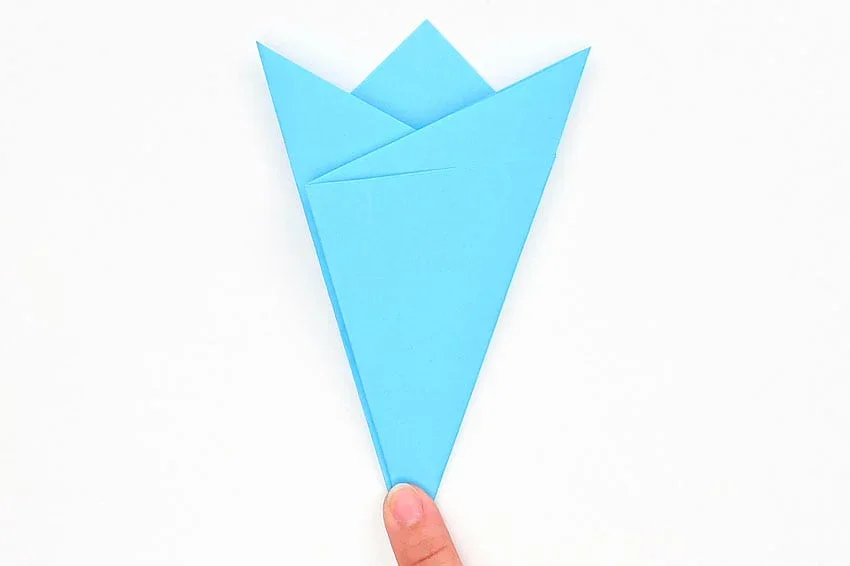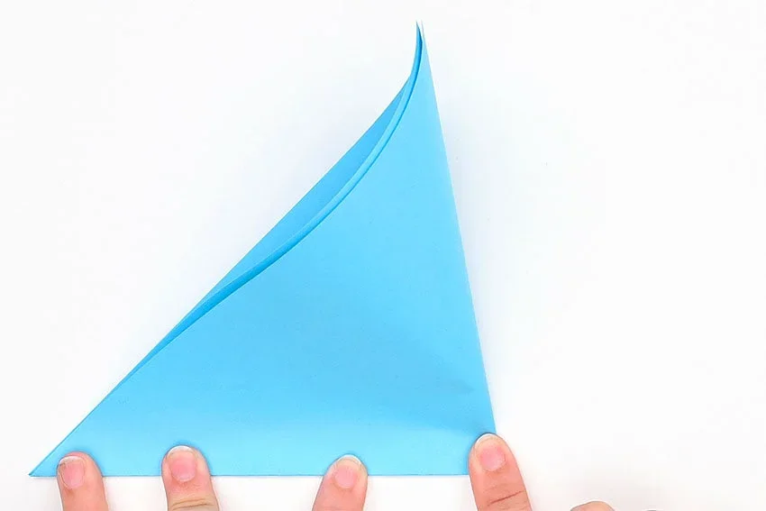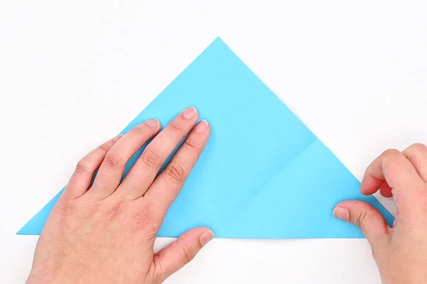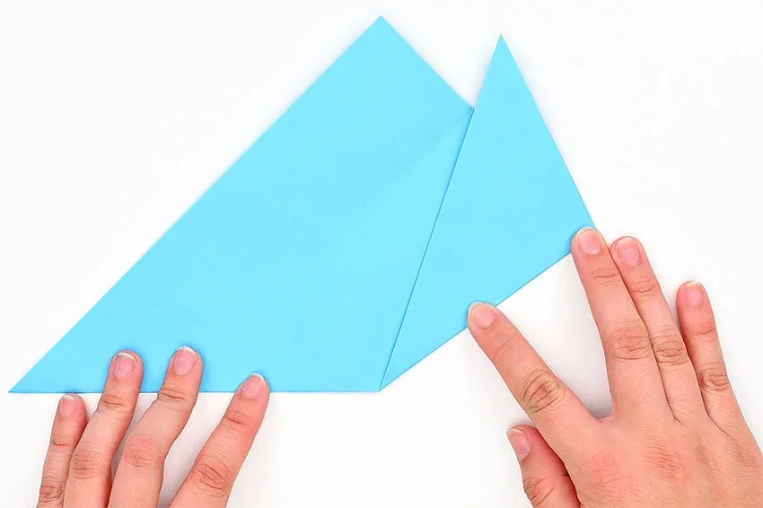 Align the Bottom Right Edge. Now, take the bottom right edge and fold it over to align with the left edge. Press down firmly to secure the fold. You should now have a tall triangle shape with three pointed edges at the top.