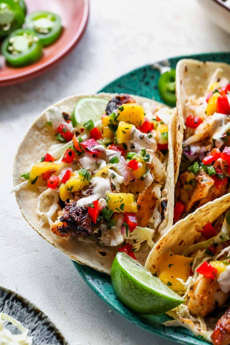 Baja Fish Tacos featuring perfectly pan-seared, spiced white fish, a tangy Baja sauce, and a vibrant mango salsa. These delicious, ...