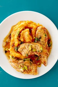 This quick chicken dish is topped with a sweet maple syrup glaze, while refrigerated mashed sweet potatoes serve as a ...