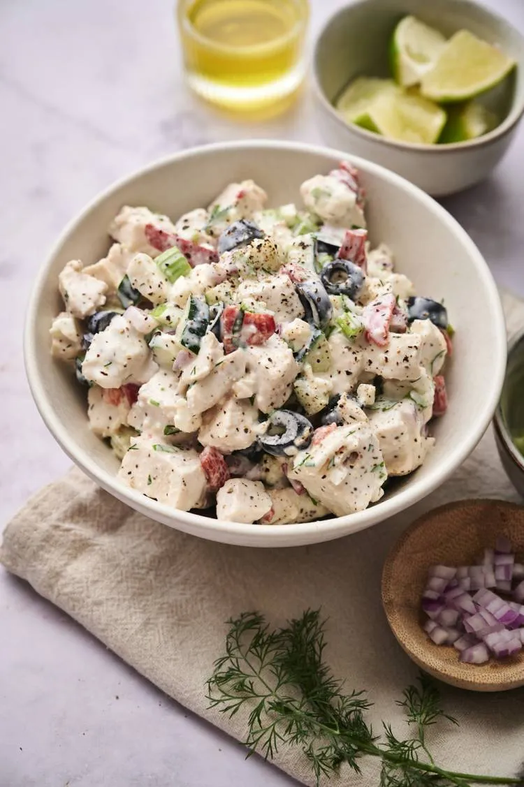Mediterranean Chicken Salad is a flavorful twist on the classic chicken salad. Packed with black olives, roasted red peppers, cucumbers, ...
