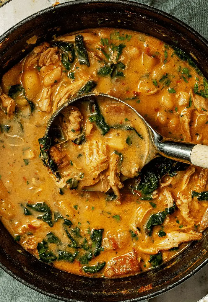 - Return the shredded chicken to the pot. Add kale and heavy cream, then simmer for 5 minutes until the kale is wilted.