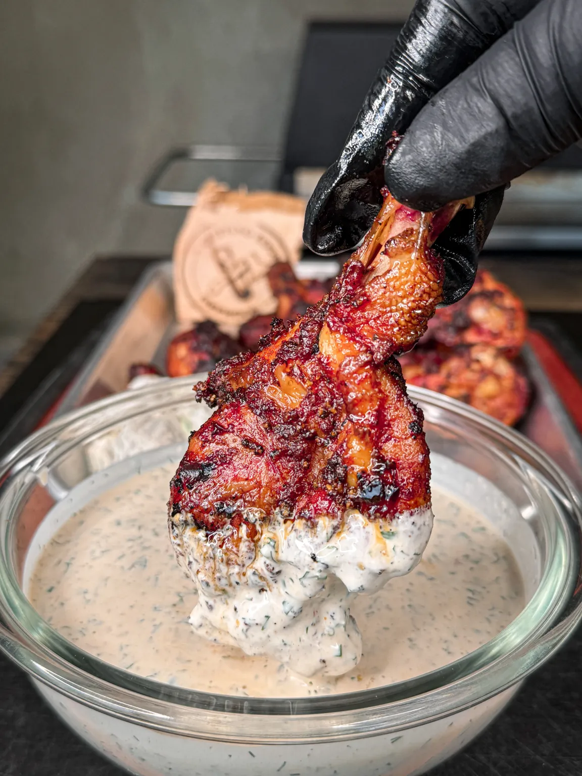 - Once the chicken is fully cooked, remove it from the grill and serve with the Chipotle Ranch Dipping Sauce.