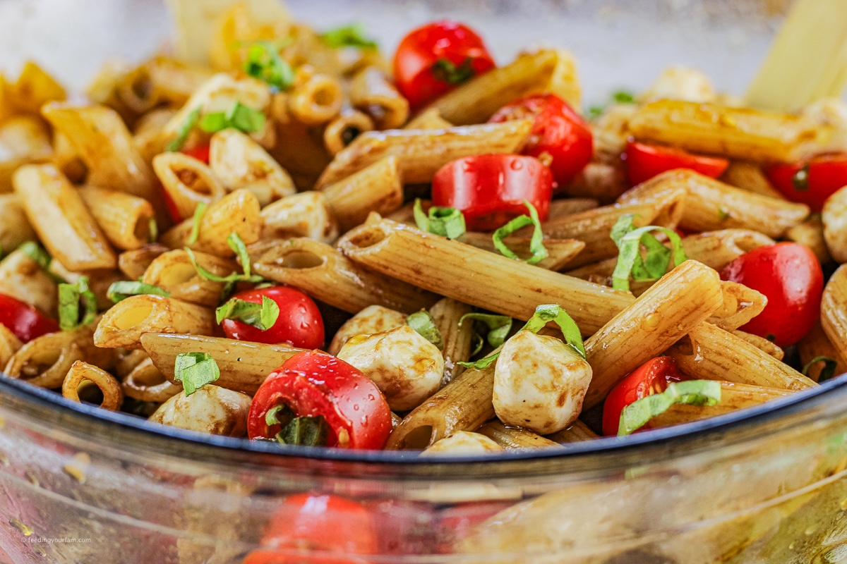 - Drain the pasta and rinse it under cold water to cool. In a large bowl, combine the pasta, tomatoes, basil, and mozzarella.