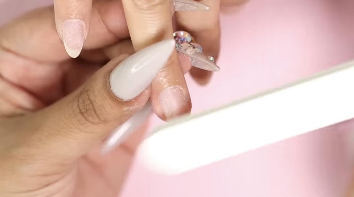 For instance, you can employ either an oval or crescent-shaped file to delicately adjust both sides of the free edge of the nail, as illustrated in the accompanying image.