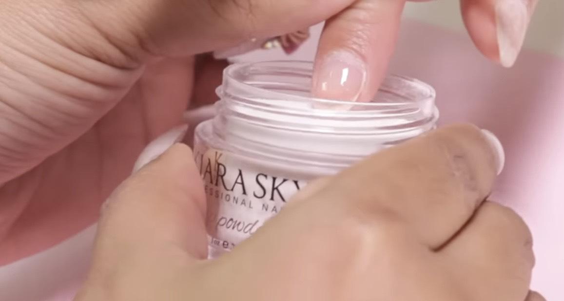 Start by shaking the sealed container of powder thoroughly. After opening the container, use a nail stick or pusher to mix the powder. Gently push your finger forward into the container and roll it softly. Allow your finger to remain in the powder for five seconds. Lift your finger and tap the edge of the container. Then, using your other hand, tap the dipped finger to shake off excess powder back into the container. Once the nail has dried, employ a nail brush to eliminate any remaining excess powder over a paper towel. Avoid using colored powder at this stage. If you wish to add color, that step will come after applying more resin.