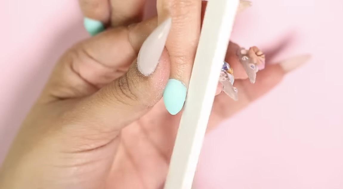 Regardless of whether your nails are natural, acrylic, or gel, ensure the surfaces are smooth by manually filing them. Utilize a 180 grit file or block, or opt for a natural nail stone. Clear away the filing residue using a nail brush or a makeup powder brush.