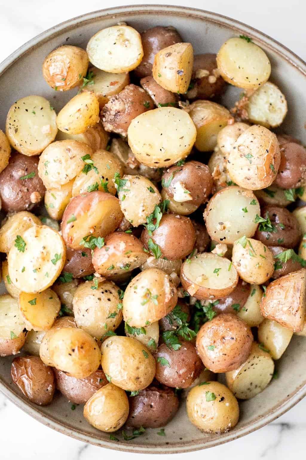 Roasted Garlic Parmesan Baby Potatoes: These crispy, tender baby potatoes are loaded with garlic and Parmesan flavor and ready in just 30 minutes.