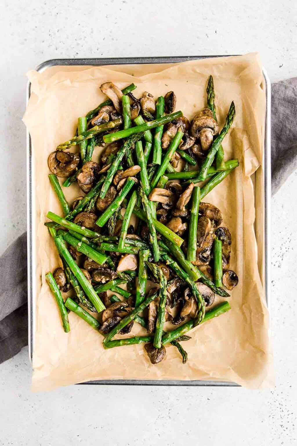 Roasted Asparagus and Mushrooms: This simple sheet pan recipe combines garlic, asparagus, and mushrooms for a flavorful vegan side.