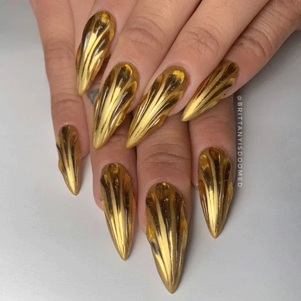 These nails are typically long and narrow, with a sleek, glossy finish. They can be adorned with delicate gold flakes, sparkling glitter, or intricate floral patterns. The gold color adds a touch of opulence and glamour, making these nails perfect for special occasions.
