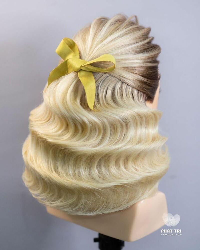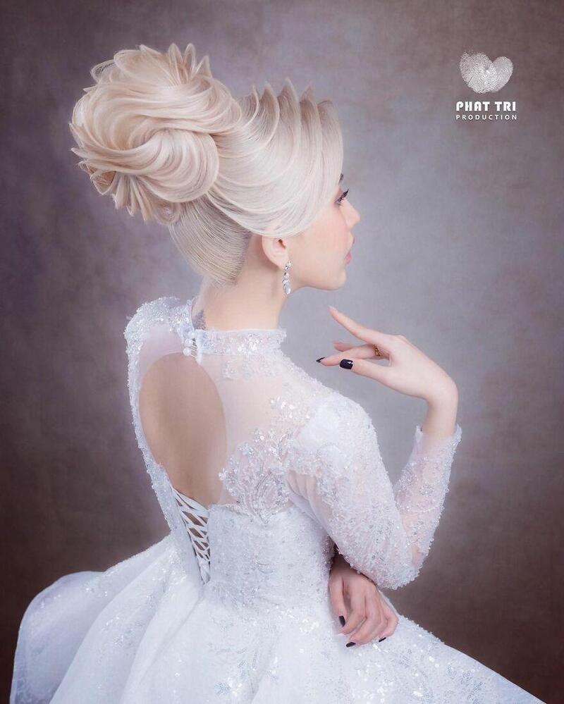With a smooth, bouncy blowout showcasing gently sculpted waves and plenty of volume, this bride’s bright blonde hair embodies the essence of romance. Whether you enlist a professional or choose to style it yourself, blow-drying your hair will give you added bounce and shine for a stunning wedding look.