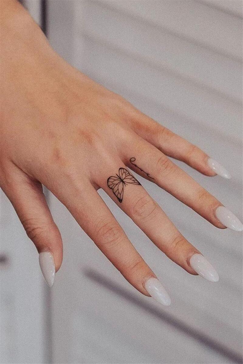 A butterfly tattoo on the finger symbolizes beauty, freedom, and transformation. Its delicate nature makes it an ideal choice for a smaller tattoo design, and it can represent personal growth, new beginnings, or simply a love for the natural world. Butterflies can be inked in various styles, from colorful and whimsical to bold and minimalist.