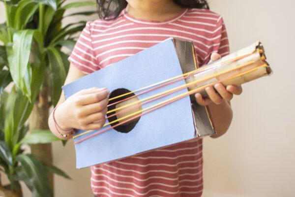 The best part? It’s a quiet, fun activity that lets kids experiment with sound without being overly noisy, making it a parent-approved way to pass the time. Your little musicians will love strumming their very own homemade guitar!