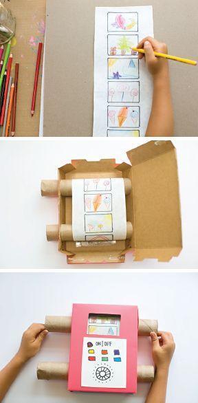 Remember making those fun crafts in school? Bring that nostalgia to life by creating a cardboard TV that scrolls through your kids’ artwork or stories! Use a large cardboard box to create the TV frame and then cut a long strip of cardboard to serve as the “screen” that you can roll.