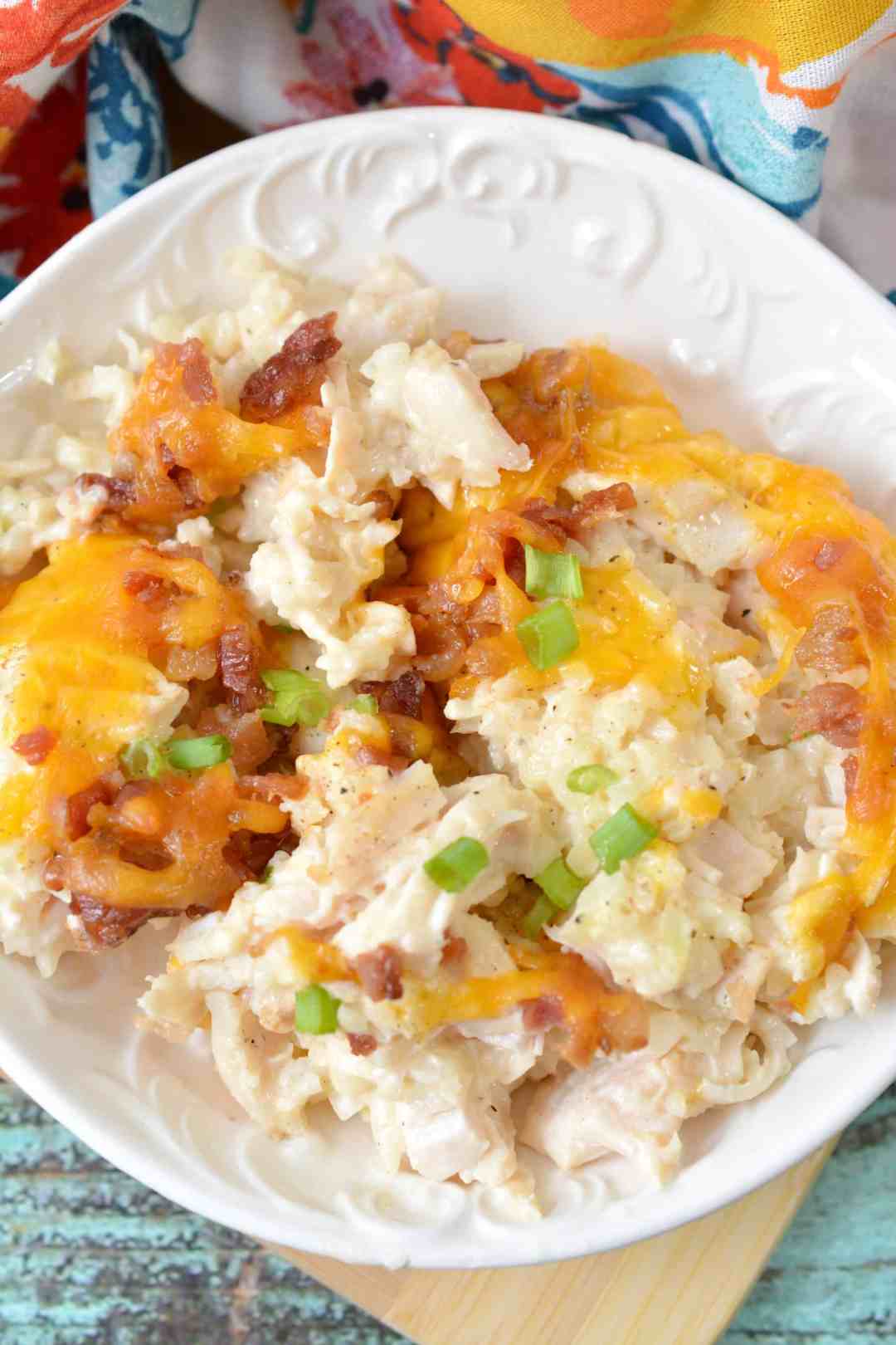 - Sprinkle the top with bacon crumbles and the remaining ½ cup of cheddar cheese.