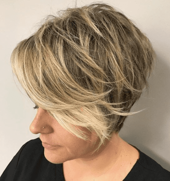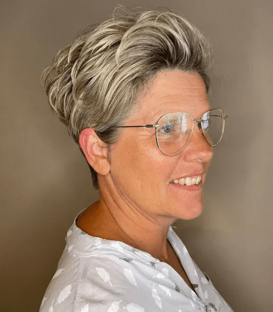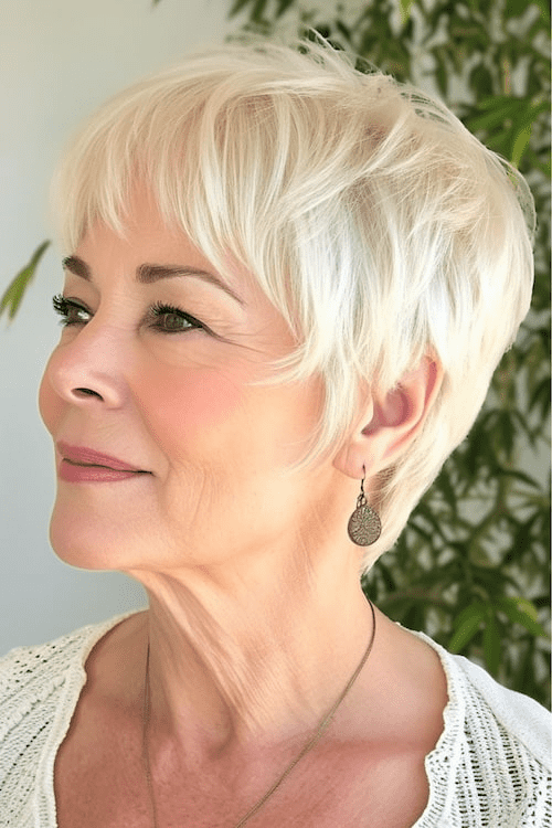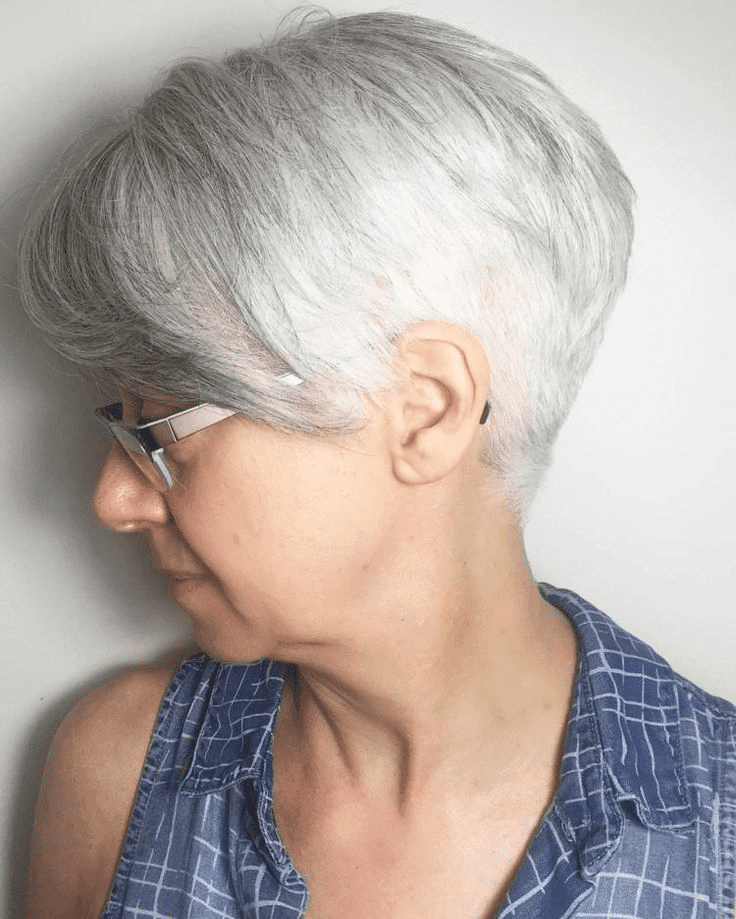 Pixie cuts are undoubtedly among the trendiest and most low-maintenance styles. Opt for a light blonde shade to cover grays, adding a fashionable and youthful touch. The silver hair color also gives fine hair a thicker, fuller, and more captivating appearance.