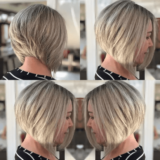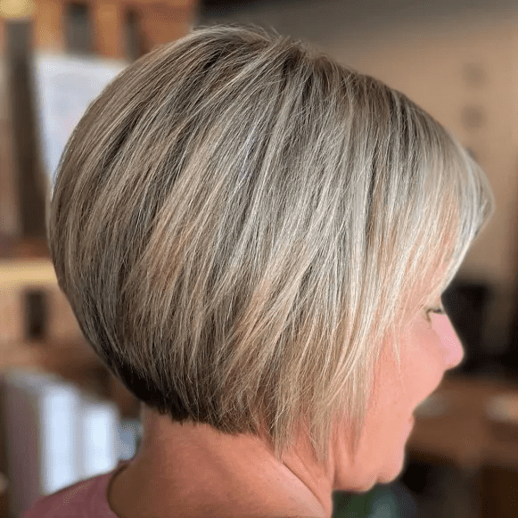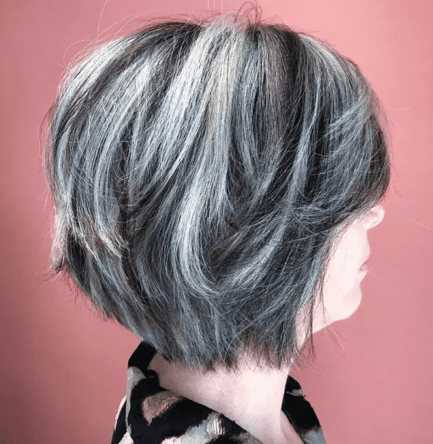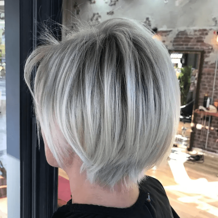 The stacked bob is a chic, casual, and low-maintenance style. Dark roots add a touch of sophistication to silver hair, giving it a more polished and youthful appearance.