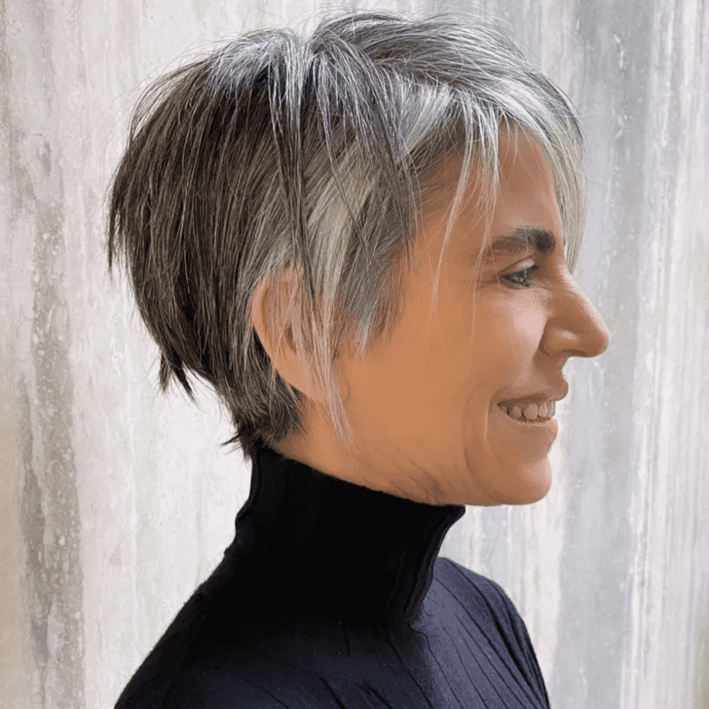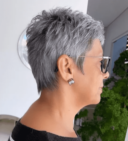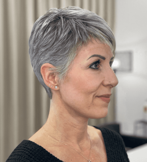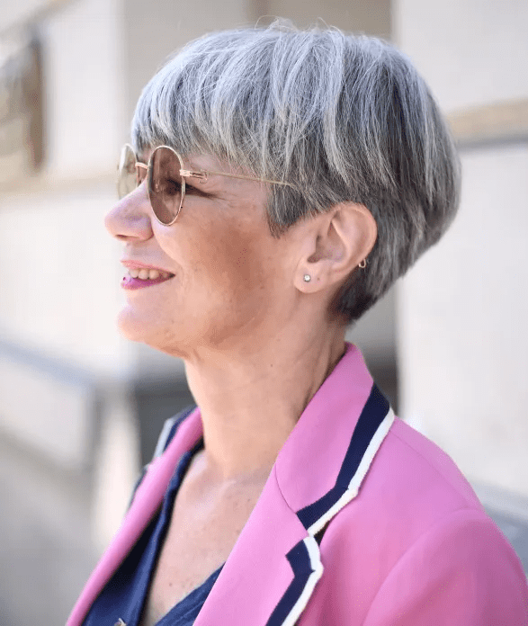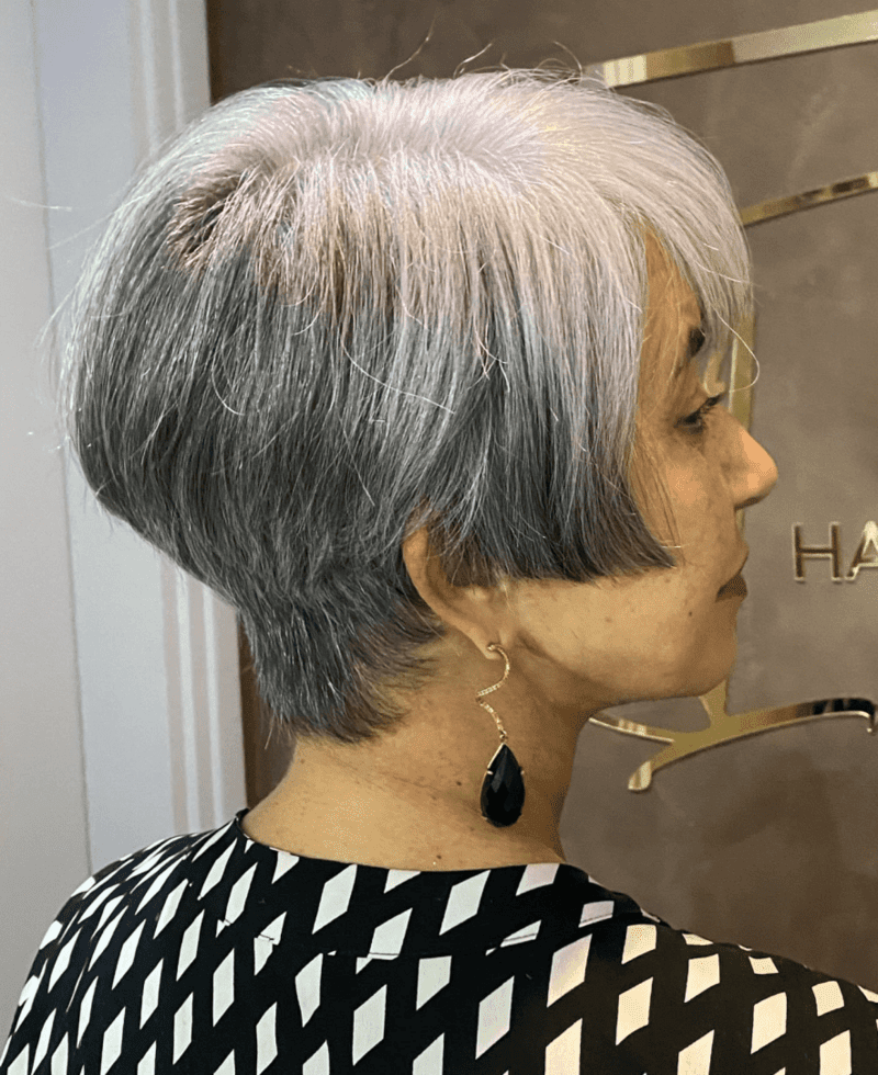 Everyone should discover their signature look that reflects their personal style, personality, and lifestyle while highlighting their best features. This gray pixie cut could become her unique X factor.