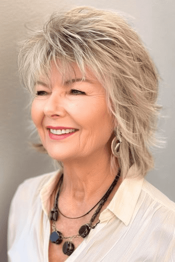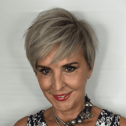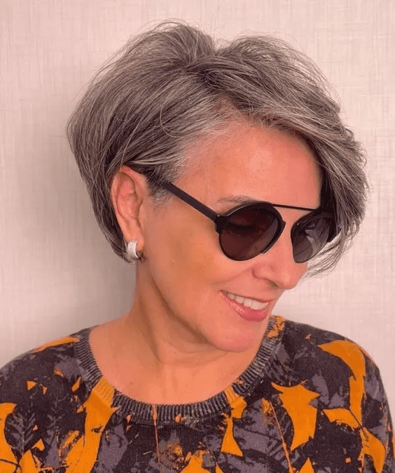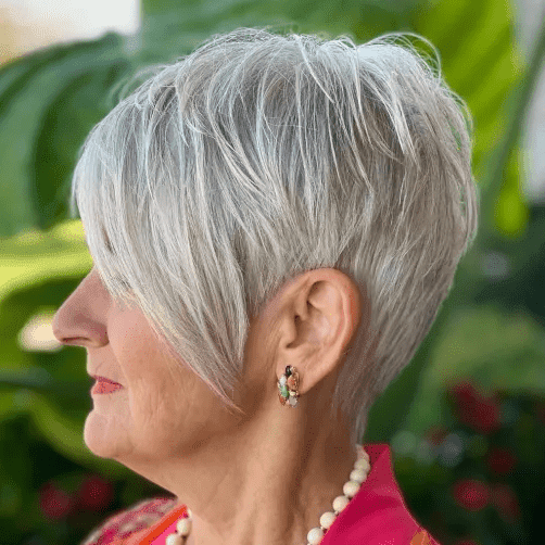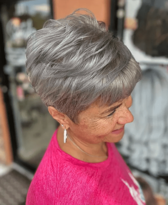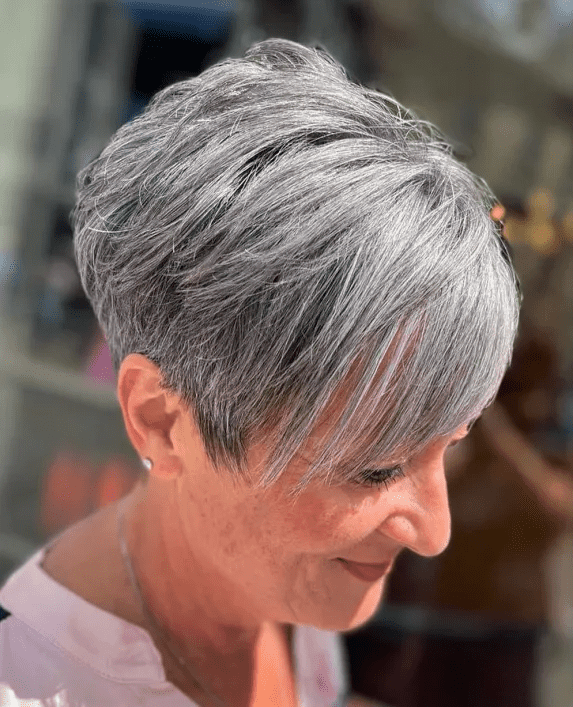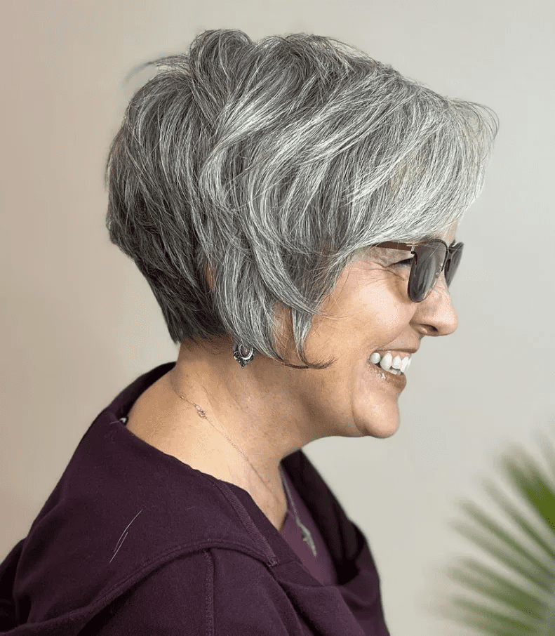 Styling your gray hair into a pixie cut is a great way to maintain a fashionable and polished look as you age. Neat feathered layers and face-framing bangs can help conceal a thinning hairline.