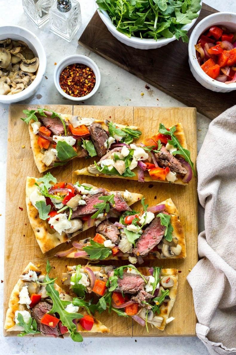 Steak Gorgonzola Flatbread: Flatbread topped with steak, gorgonzola, tomatoes, and arugula—a quick and gourmet treat.
