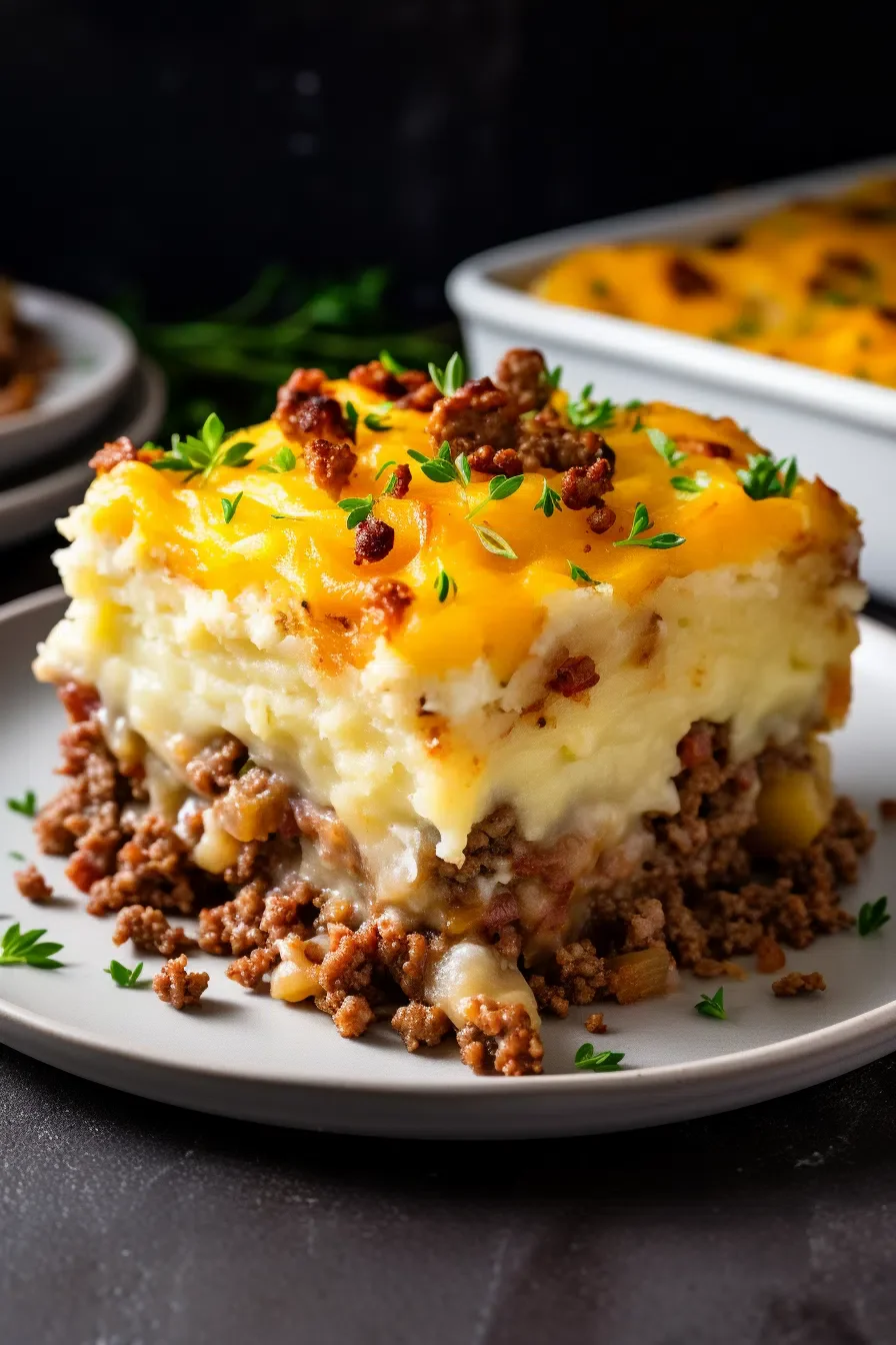 Meatloaf topped with mashed potatoes, cheese, and bacon—a true comfort food classic.