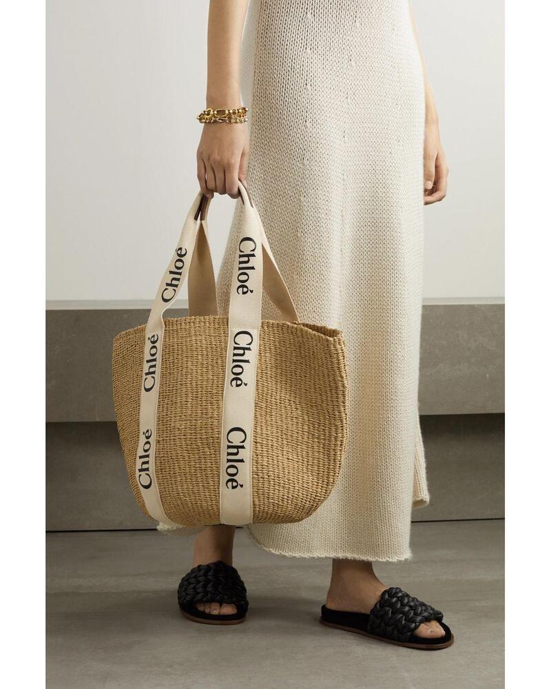 CHLOE WOODY LARGE PRINTED LEATHER-TRIMMED CANVAS AND RAFFIA TOTE