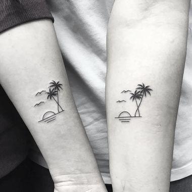 For couples seeking Hawaiian tattoos that embody tropical elegance, this design is a perfect choice. It features two matching palm trees with finely detailed slender trunks and lush fronds. This design symbolizes a shared bond and a special connection to Hawaii.