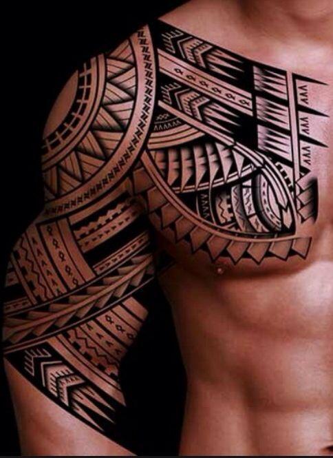 Shoulder tattoos have a way of capturing attention, and this design is a perfect example. It spans across the shoulder and upper arm, accentuating the natural contours of the body. The use of Polynesian geometric patterns and bold lines adds to its visual appeal and significance.