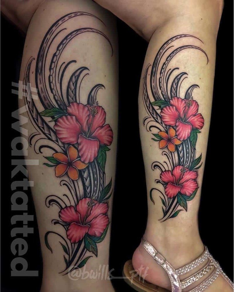 Calf tattoos are always in style, and this Hawaiian design is an excellent choice if you’re considering one. It features symmetrical geometric shapes and intricate patterns that create a sense of harmony and balance. You can enhance the tattoo with Polynesian and Hawaiian motifs like turtle to symbolize concepts such as strength and courage.