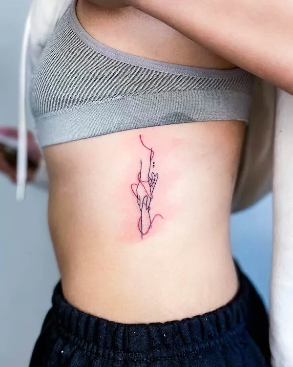 A helping hand can make all the difference during tough times, as symbolized in this small rib tattoo. The red thread signifies the strong bond between two people, adding depth and emphasis to the design. Together, the tattoo advocates for mental health, kindness, and the power of friendship, offering a meaningful message of support and connection.