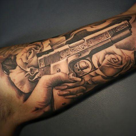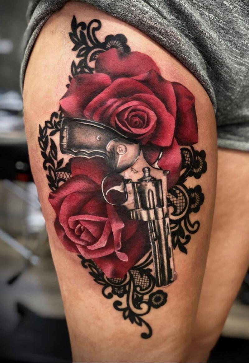 Preferable Ink: This design is best executed in shades of pink or red for the roses, paired with black ink for the guns.