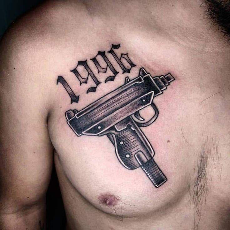 Gun tattoos are often placed on longer, narrower areas of the body, such as the legs, arms, and sides. This is because weapons tend to be longer than they are tall, making these locations ideal for displaying the design. When considering your gun tattoo, you have the freedom to choose nearly any design. Curvilinear patterns work beautifully along the contours of the gun, and you can also incorporate additional elements alongside it.