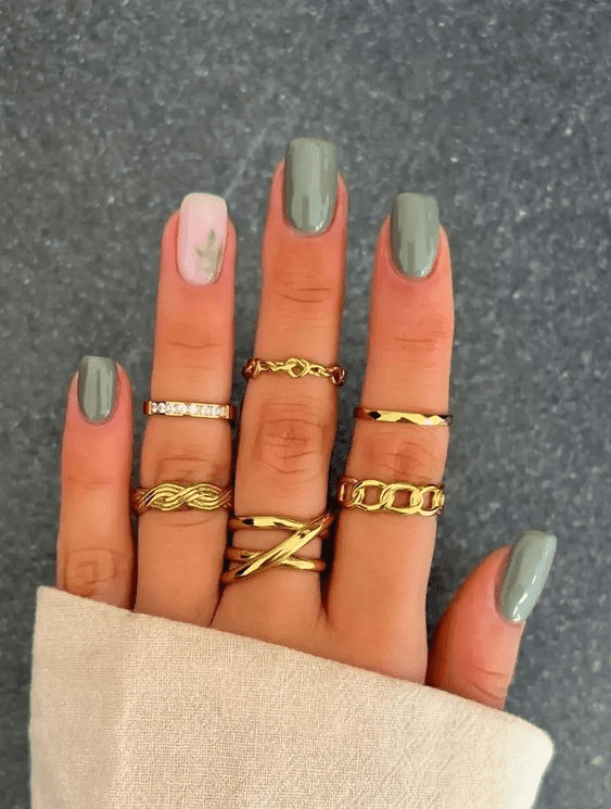 Looking for a manicure that’s both trendy and natural-feeling? Look no further than the “down to earth” olive green nail design! This style combines olive green with another earthy tone, like a warm gray, taupe, or even a sandy beige. You can paint your nails all one color and then add an accent nail in the other shade, or create an interesting design with both colors. This color combination is super versatile and goes well with any outfit. It’s perfect for those who love the outdoors and appreciate a calming, nature-inspired aesthetic.