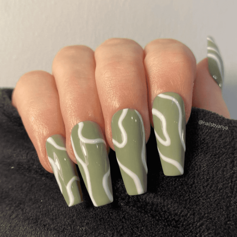 Love the richness of olive green but want to add a touch of whimsy? White swirls on olive green nails offer the perfect combination! This elegant design features delicate white swirls dancing across your olive green base. It’s like having tiny works of art on your fingertips! The white adds a light and airy feel, making it suitable for any nail length or shape. You can create thin, wispy swirls for a subtle effect or thicker, bolder swirls for a more dramatic look. This manicure is perfect for those who want something unique and classy, ideal for any occasion.