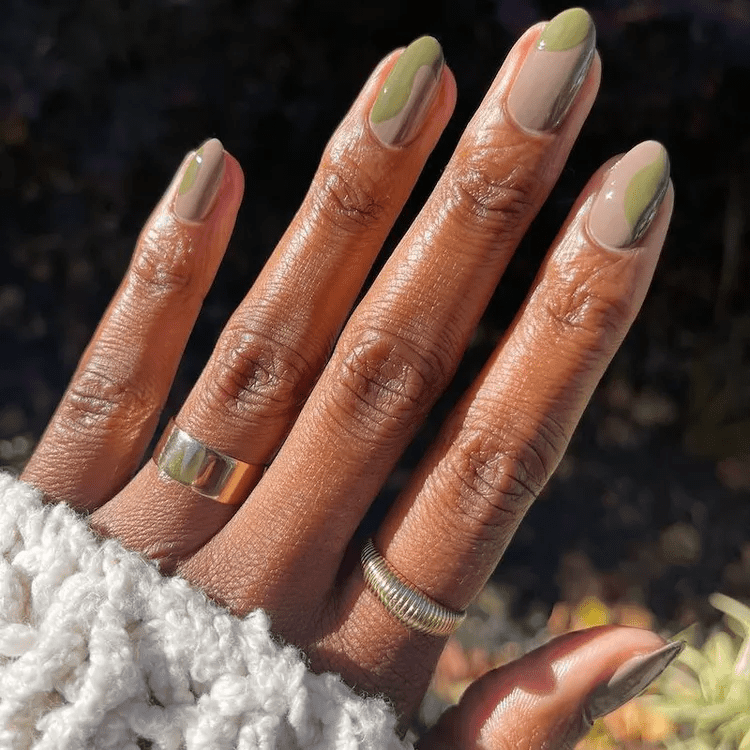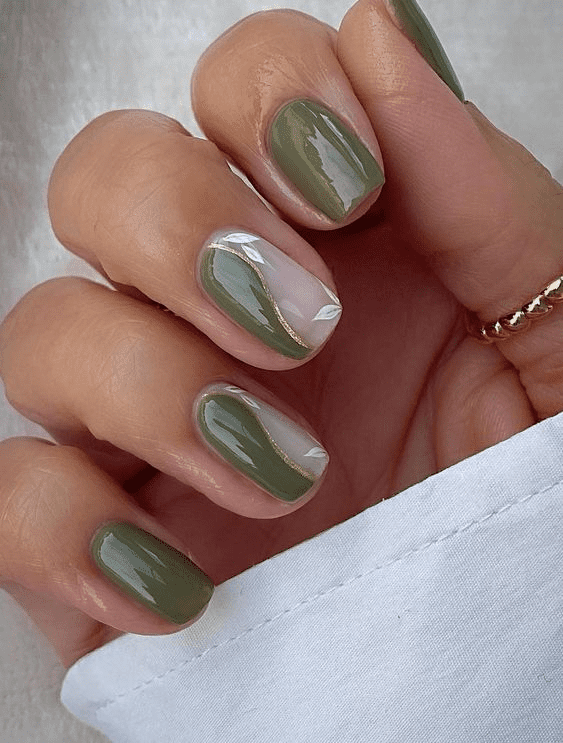 Get ready to channel your inner flower child with groovy swirls olive green nails! This design brings back the retro vibes with psychedelic swirls of olive green painted on a bare nail or a neutral base like nude or cream. You can create thin, wispy swirls for a delicate look, or thicker, bolder swirls for a more dramatic statement. This playful manicure is perfect for summer or anytime you want to add a touch of fun and personality to your nails. For an extra groovy touch, consider adding a pop of another color like orange or yellow to some of the swirls. Let your creativity loose and embrace the groovy vibes!