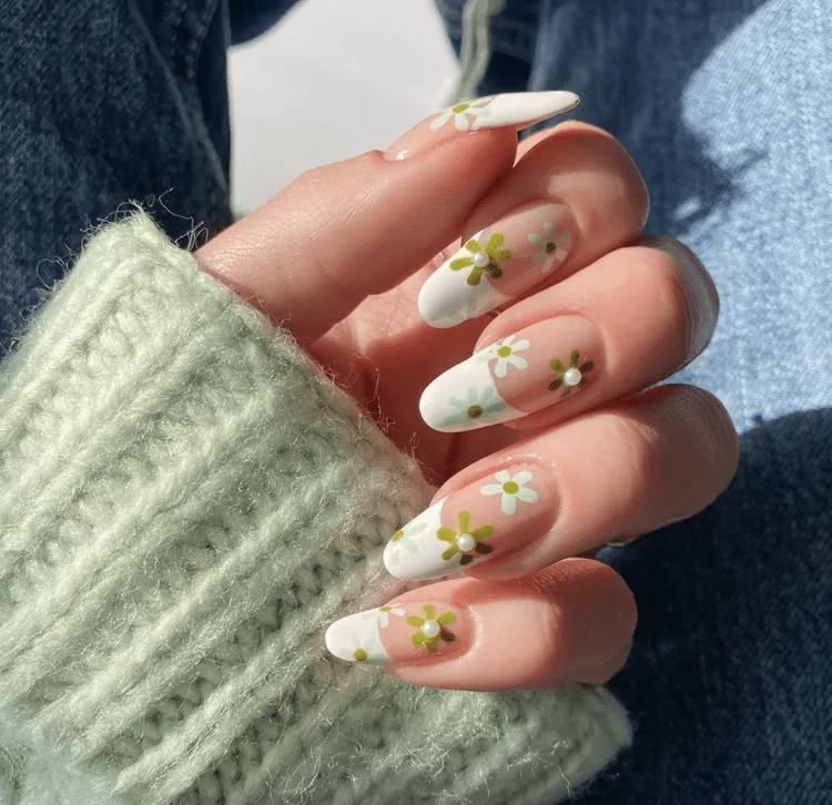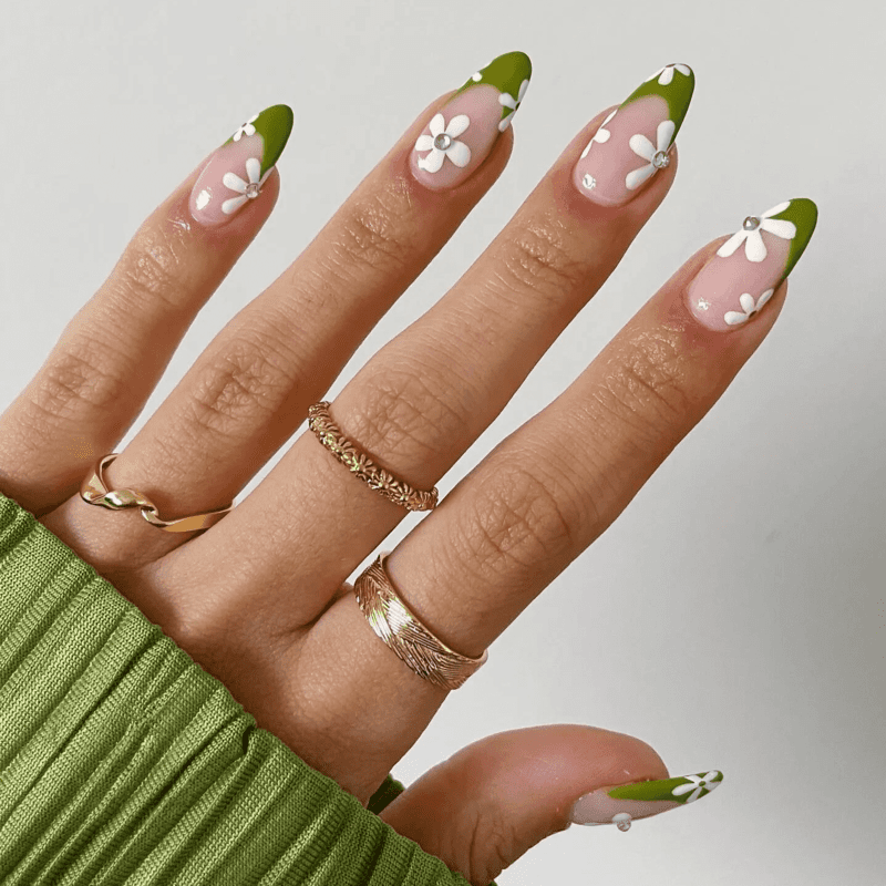 Floral and olive green nails are a beautiful and fresh nail design that brings together the natural, calming color of olive green with the delicate and pretty look of floral patterns. Usually, these nails have a soft olive green base, which serves as a backdrop for lovely flower designs painted in various colors like pink, white, or yellow. The floral patterns can be simple and small or more detailed and large, adding a touch of nature and elegance to the nails. This design is perfect for spring and summer, giving a cheerful and vibrant feel to your look. Floral and olive green nails are ideal for everyday wear, special occasions, or even a day out in the garden. They create a charming and stylish appearance, making your nails look like a piece of art inspired by nature. This nail style is loved by those who enjoy a sweet, feminine, and fresh touch in their fashion.