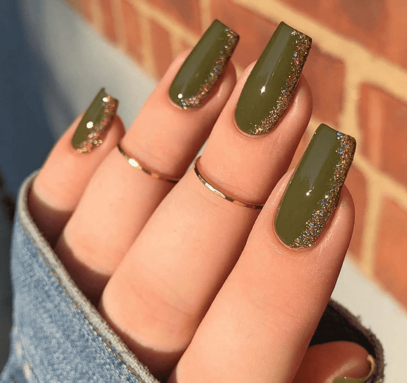 Feeling festive? Olive green and gold glitter is a stunning combination that adds a touch of glam to your nails. You can paint all your nails olive green and then add a glittery gold accent to one or two fingers. This could be a simple gold glitter stripe down the center of the nail or a cluster of gold glitter near the tip. Another fun idea is to paint your nails in a sparkly gold glitter polish and then add an olive green matte stripe or design on top. This creates a luxurious and eye-catching look that’s perfect for a night out or any time you want to add some sparkle to your day.