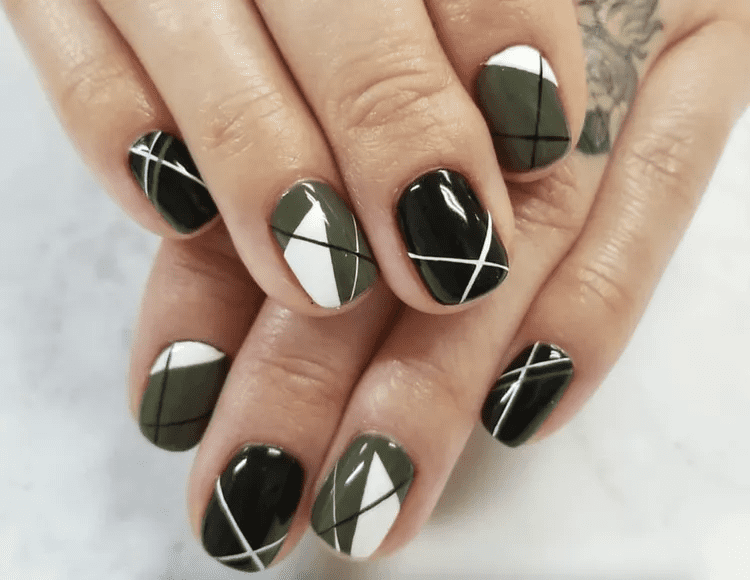 Olive green and checkerboard patterns are a perfect match! This fun and trendy design combines your love of olive green with a bold, graphic element. You can paint all your nails in olive green and then create a checkerboard design in black or white on one or two accent nails.  For a softer look, use a lighter shade of green and cream for the checkerboard squares.  No matter your preference, olive green checkerboard nails are sure to turn heads and show off your playful side.