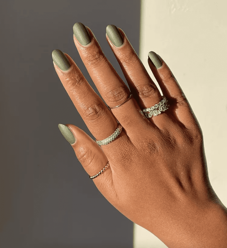 Want to add a modern twist to your olive green manicure? Then go matte! A matte finish transforms olive green from classic to edgy. It gives the color a velvety texture that’s both sophisticated and eye-catching. This style works well with any nail length and shape, just like a glossy finish. To achieve the matte look, you can either use a matte top coat over your regular olive green polish or find a polish that already has a matte finish. It’s a simple way to elevate your mani and make a bold statement.