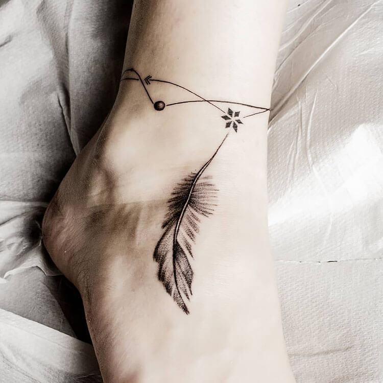 Embrace your bohemian spirit with this striking feather ankle bracelet tattoo. This bold design not only makes a statement but also carries deep symbolism—feathers represent strength, courage, and freedom. Adorning your ankle with this tattoo adds a unique touch of artistry and a reminder of your adventurous nature, beautifully blending style with meaning.