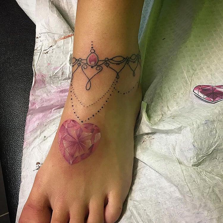 Make a bold statement with this unique ankle bracelet tattoo featuring colorful gemstones. The vibrant hues are sure to make any outfit pop, making it perfect for the woman who loves to stand out. This eye-catching design adds a playful touch of glamour to your ankle, allowing you to express your individuality and love for all things bright and beautiful.