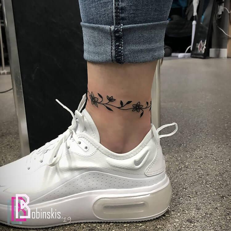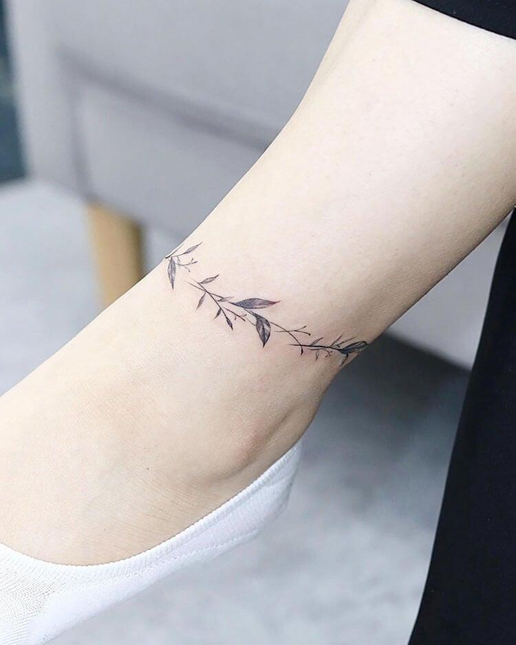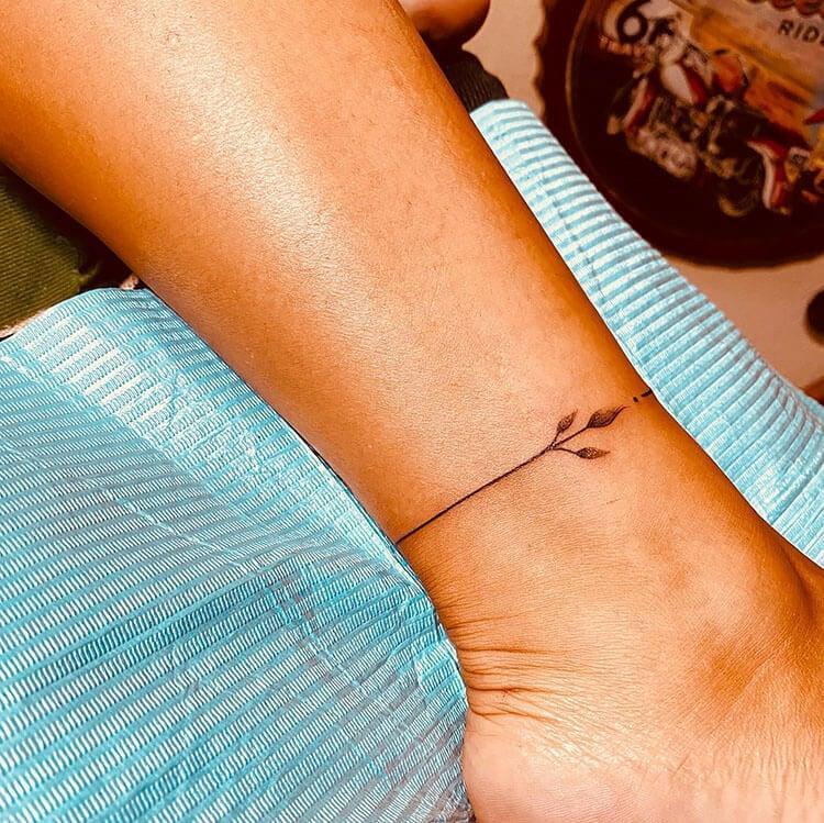 If you’re drawn to minimalist designs, this one might catch your eye. Featuring a subtle leaf-like detail, the rest of the tattoo consists of a simple, clean line encircling the ankle. It’s understated yet elegant, offering a delicate and timeless look.