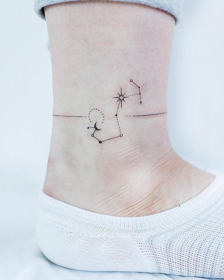 Draw inspiration from the night sky with a constellation ankle tattoo. This unique design is perfect for anyone who loves astronomy or simply enjoys gazing at the stars. The delicate arrangement of constellations creates a captivating look, turning your ankle into a celestial canvas that celebrates the beauty and mystery of the universe.