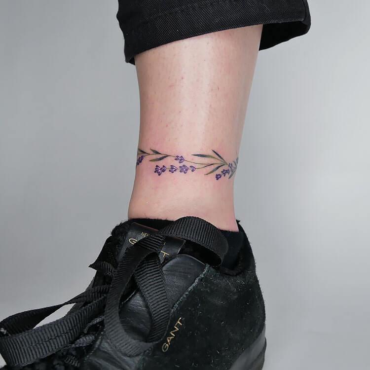 Add a splash of color and femininity to your steps with this lovely lavender ankle bracelet tattoo. Perfect for the woman who adores flowers, this design offers a soft and subtle touch while still making a charming statement. The delicate lavender blooms bring a sense of tranquility and elegance, beautifully enhancing your ankle with a hint of floral grace.
