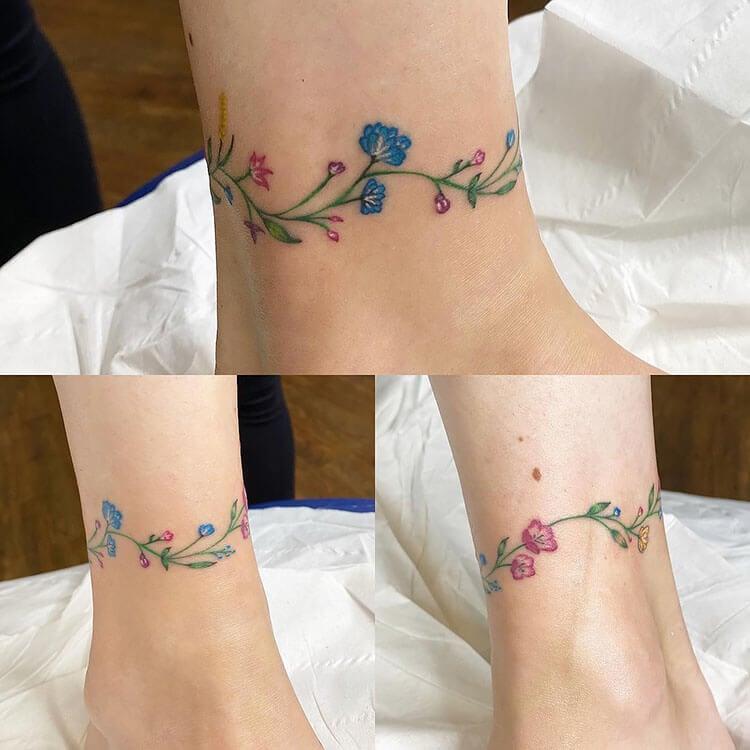 Add a touch of romance and femininity to your ankles with this delicate floral ankle bracelet tattoo. The simplistic details of the design create an elegant and timeless look, allowing the beauty of the flowers to shine through. It’s a perfect choice for anyone looking to embrace a soft, charming aesthetic while enhancing their style with a meaningful piece of art.