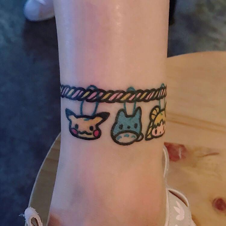 This adorable animation-themed ankle bracelet features beloved characters like Pikachu and Totoro, adding a playful and nostalgic touch. You can personalize your ankle bracelet tattoo by incorporating your favorite animated characters as charming “charms,” making it a fun and unique way to express your love for animation while wearing your fandom proudly.