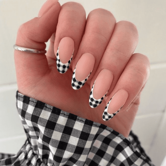 Short French nails don’t have to be limited to solid color tips. Take your manicure to the next level with patterned tips! This playful option allows you to showcase your unique style and add a touch of whimsy. There are endless possibilities for patterned tips, from classic polka dots and stripes to intricate florals or geometric designs. You can even get creative with negative space nail art, incorporating patterns into the base coat that peek through the French tip.