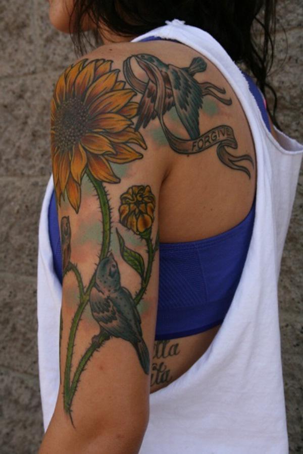 A whimsical, dark tattoo depicts a bird perched on a branch, another holding a ribbon inscribed with “Forgive,” all against a vibrant sunflower. It’s a poignant piece that speaks volumes.