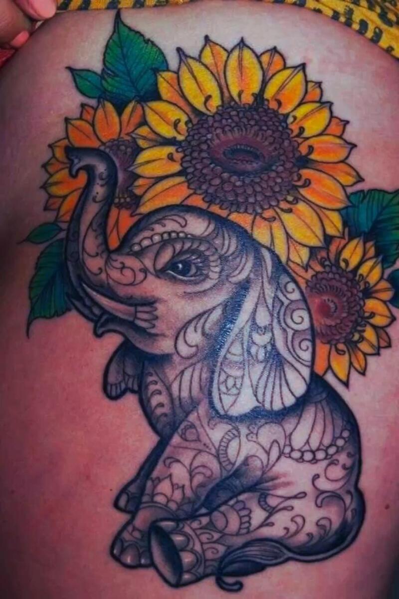 A breathtaking tattoo features a realistic elephant head, its wise eyes gazing out from a vibrant halo of sunflowers. This design combines the strength and wisdom associated with elephants with the joy and energy symbolized by sunflowers, creating a powerful and inspiring image.