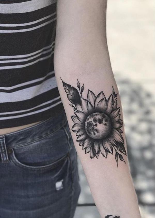 A captivating forearm tattoo showcases a black and grey sunflower, its petals gracefully transforming into the radiant face of the sun. A crescent moon, perched atop the sunflower, completes the design, creating an intriguing fusion of day and night, light and darkness.