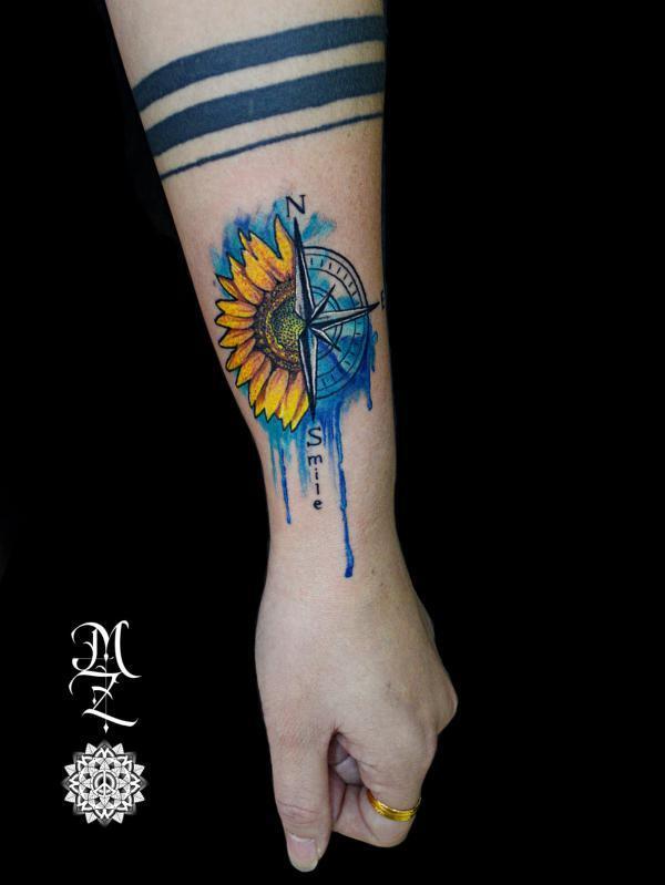 HALF SUNFLOWER HALF COMPASS TATTOO
